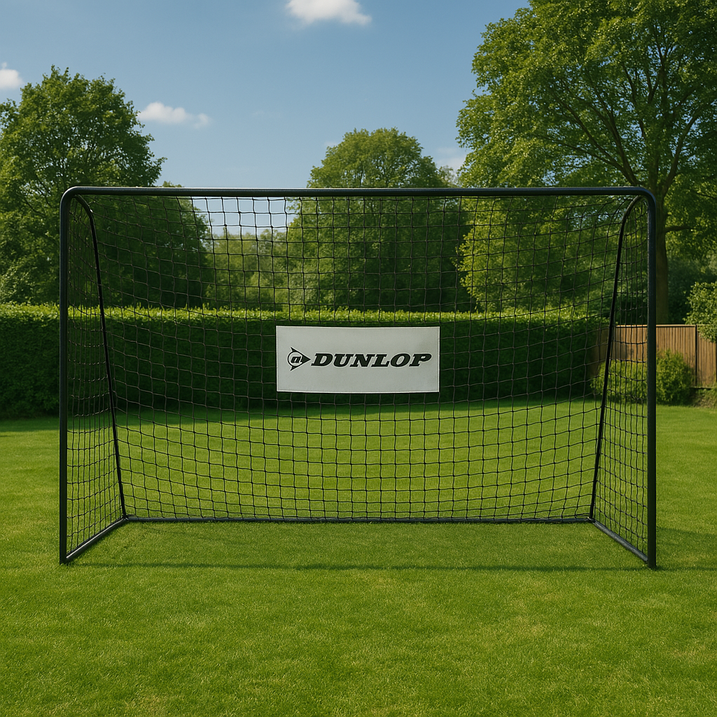 Duża bramka piłkarska Dunlop o wymiarach 300 × 205 × 120 cm, wykonana z malowanej proszkowo stali (średnica rurki 32 mm). Wyposażona w mocną siatkę odporną na warunki atmosferyczne oraz śledzie mocujące. Bezpieczna dzięki piankowym osłonom słupków. Idealna do ogrodu, na działkę lub trening z dziećmi. Szybki montaż, łatwe przechowywanie.